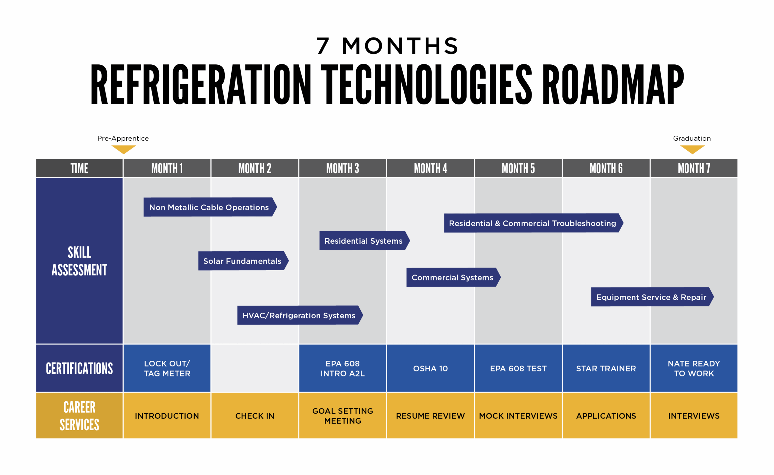 The 7-month refrigeration and HVAC training program is designed to train and prepare HVAC students for entry as service and maintenance technicians in jobs that utilize technologies employed in the fields of heating, ventilation, air conditioning and refrigeration (HVAC/R).